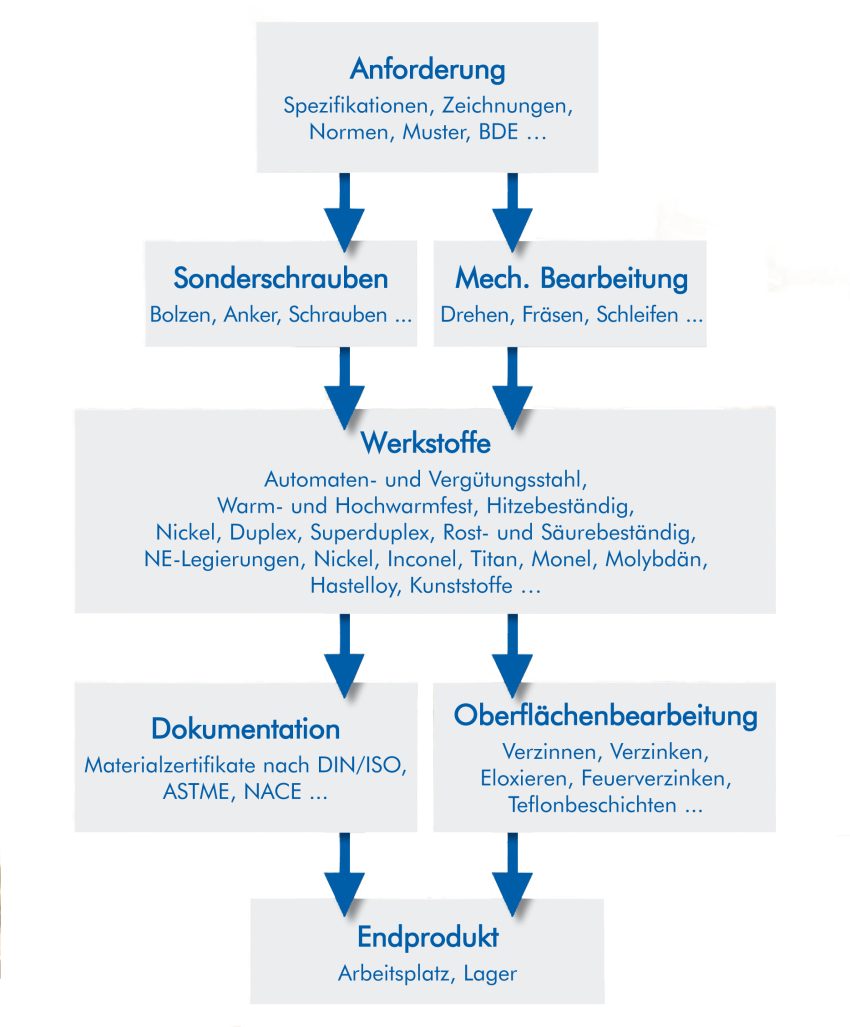 Oberflächenveredelung: Galvanisch Verzinken, Verzinnen, Feuerverzinken, Vernickeln, Verchromen, Vermessingen, Verkupfern, Schwärzen, Eloxieren, Brünieren, Phosphatieren, Sheradisieren, Chem. Nickel, Pulverbeschichten, Durni-Coatieren, Kolsterisieren®, Polieren, Elektrolytisches Polieren, Teflon®-Beschichtung, Schraubensicherung.